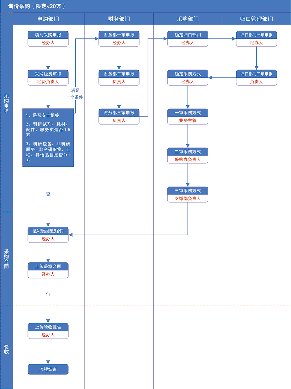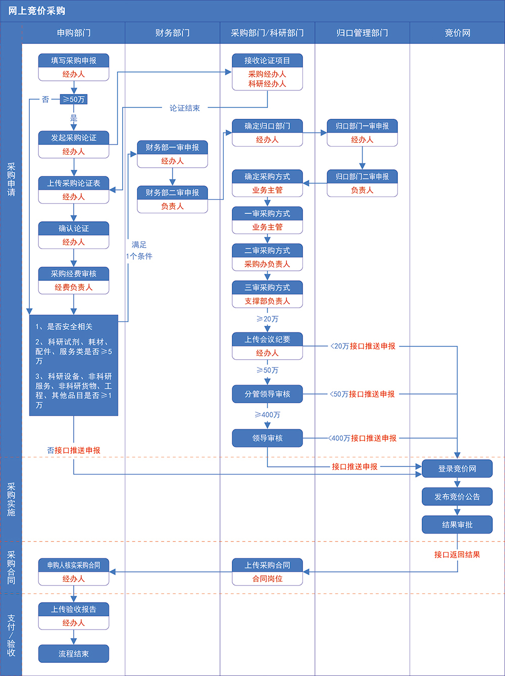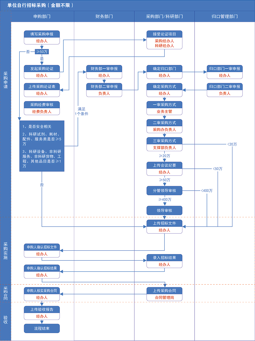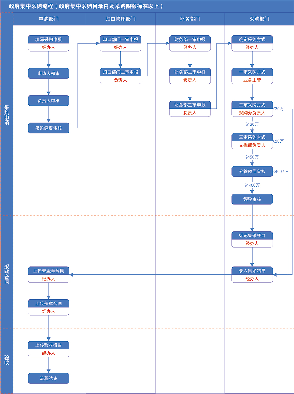 各归口管理部门负责采购项目详细预算审核、论证、技术标准确定、技术性文件和合同审批、采购验收等事项。