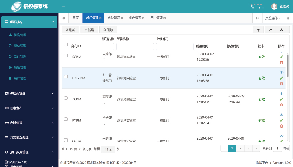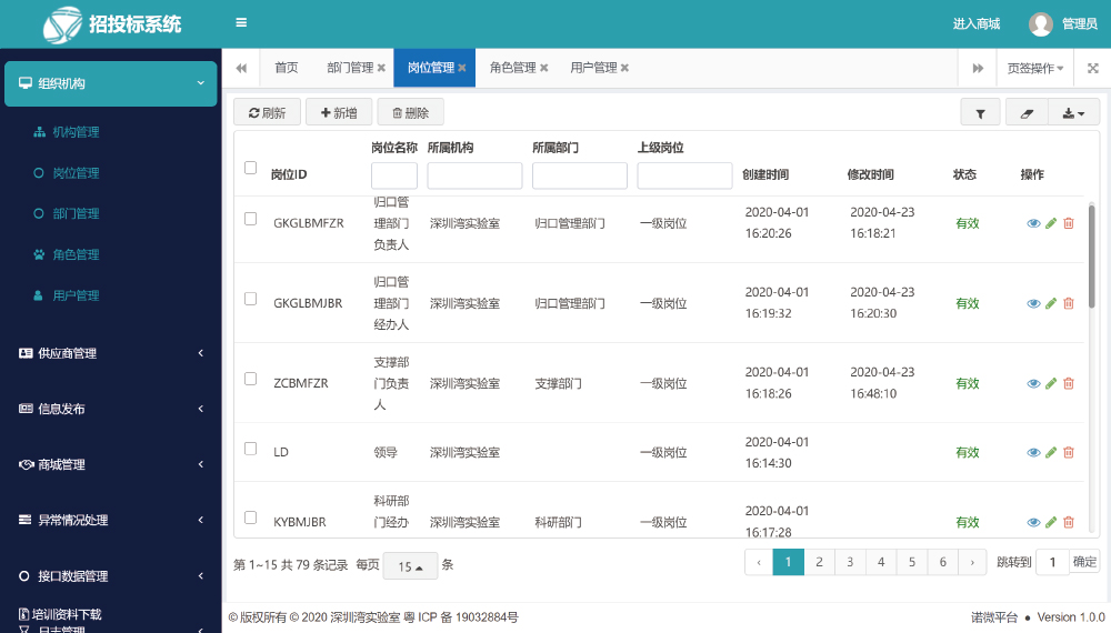 (2)采购单位库,采购代理机构库,评审专家库,执法人员库,审批机构库,代理就项目完成情况。查看政府采购经办人,固定电话,财务负责人,预算单位标识,本级预算单位,非预算单位,旗县区上划单位,暂时失效单位,查看修改历史记录。查看代理机构是否在中国政府采购网注册,专家相关信息,专家参与评标的项目,及专家的详细信息,执法人员库,审批机构库。 (3)代理机构项目完成情况,项目检测表,总项目数量,合同公告专家,采购规模,中标金额,结果公告率,合同备案率,公开招标率。项目站点,编号,项目名,组织机构,采购方式,采购/结果公告数量,报名登记,评审专家数,采购规模,中标金额,及评标方式。可实时管理查看项目相关信息。 (4)审批,维护修改相关信息需采购管理部门审批,通过后即可生效。 |