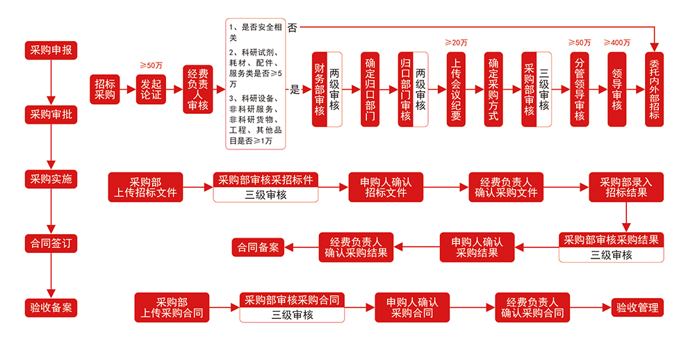 采购申请、采购审批、采购实施、合同管理、验收支付 ,按照采购程序5大步骤进行内部程序管控。