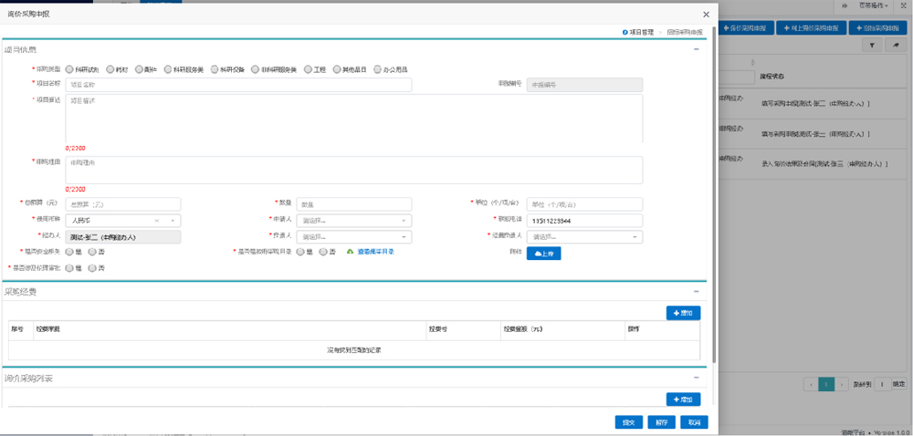 (2)采购项目立项申请由采购申请部门发起,内容包括:项目名称、采购内容概述、申购理由、采购类型、总预算、单价、数量、品类、申请人信息、负责人信息及联系方式、预算金额、采购方式等,预算归口管理部门,经费来源、经费编号、经费申请金额等)。 (3)支持按照项目采购(包含公开招标、竞争性谈判、单一来源)、竞价采购(或称电子反拍)、询价三种类型申请。 (4)可通过系统上传项目所需的多项附件。 (5)固定资产:如是固定资产项目需填写购置论证编号及附件,后续环节需设备与管理处审批。 注:项目经费申请流程可在单位财务费控系统完成,通过接口对接,或直接录入。 |