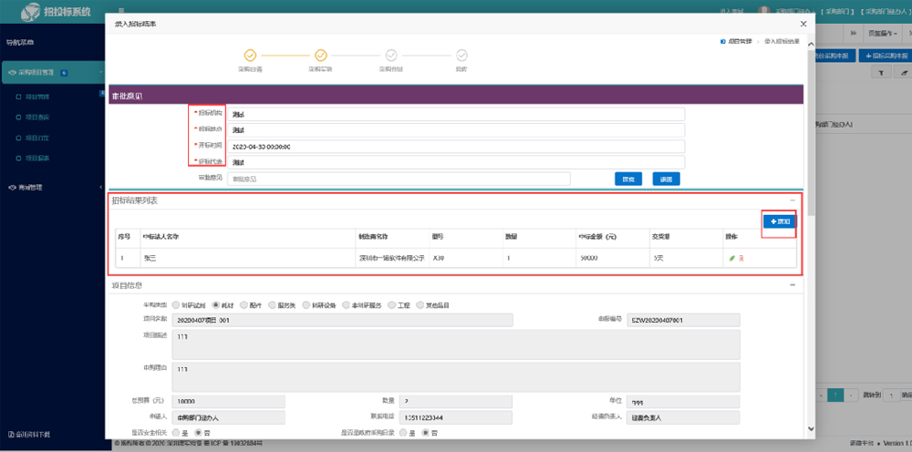 (1)招标中心项目经办人录入采购结果,并发送审批。
