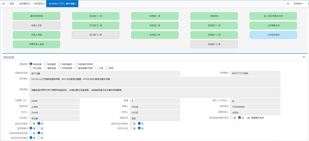 (2)可查阅项目当前的状态和当前办理人。 (3)采购申请分草稿箱、审核中、进行中、已完成等。 |